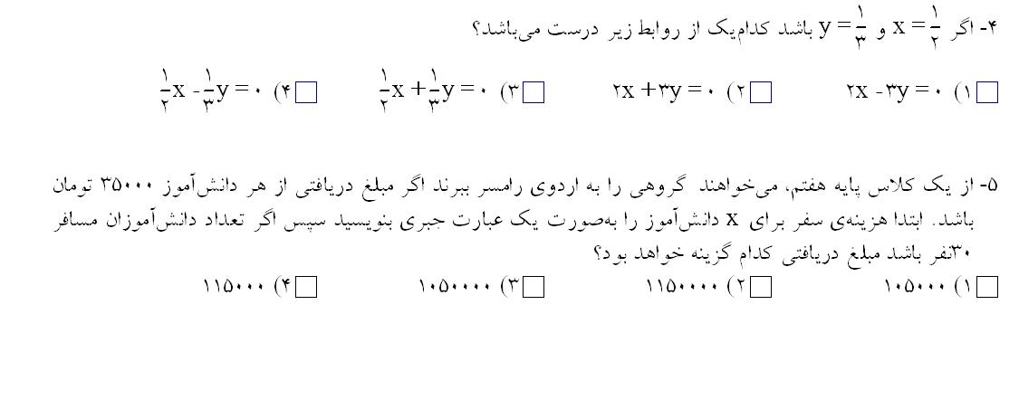 تذکر: برای شرکت در آزمون ها جواب هر آزمون را در قسمت نظرات قرار دهید. نتیجه هر آزمون بعد از تعطیلات سرکلاس اعلام میشود و طبیعتا نظرات نمایش داده نمی شوند. در ضمن به هر تعداد از سوالات که توانستید پاسخ بدهید